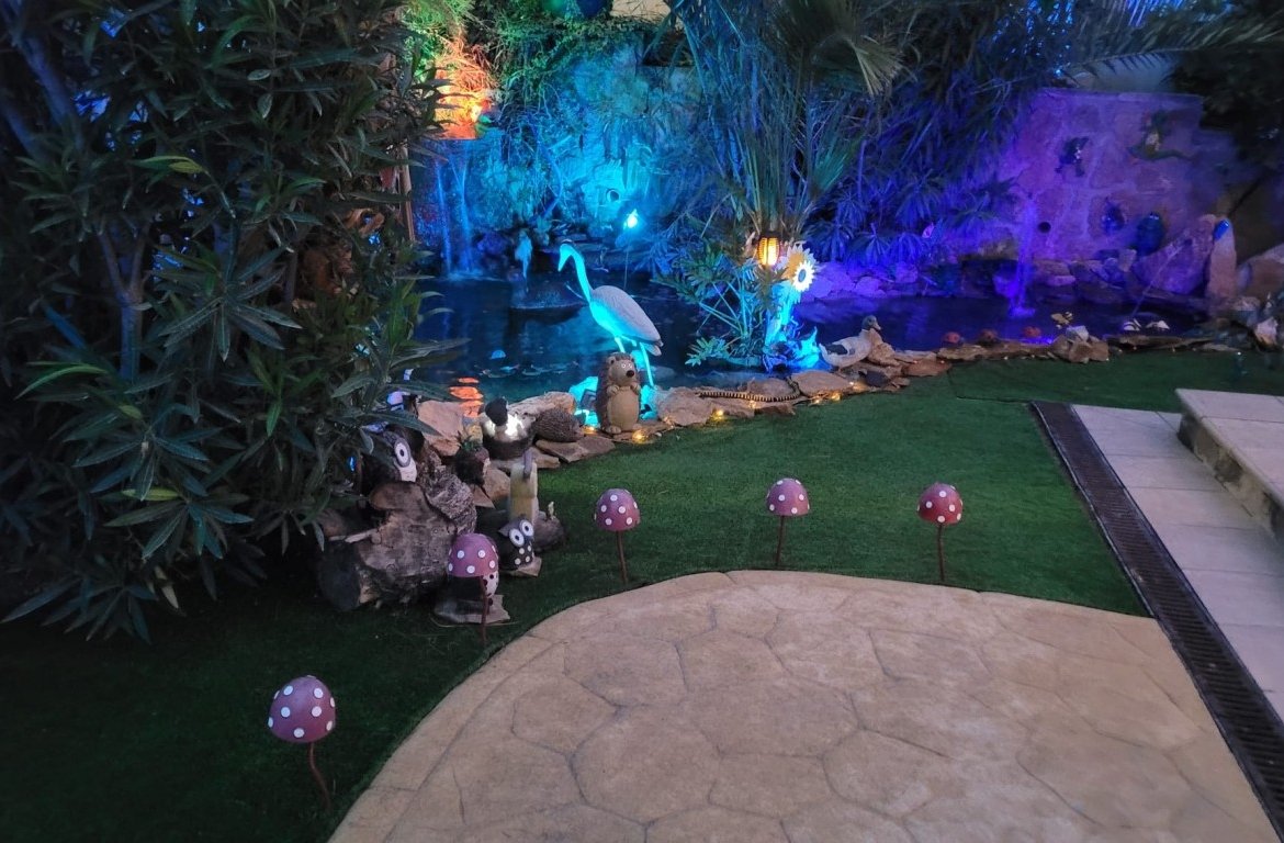 The ground floor features a guest bedroom with a private en-suite and direct access to a charming terrace complete with a tranquil fish pond and cascading waterfall. Upstairs, two additional double bedrooms offer fitted wardrobes and private balconies with breathtaking sea or mountain views. The master suite impresses with a luxurious jacuzzi en-suite and two balconies, including a Juliet balcony, while a separate family shower room serves this floor.