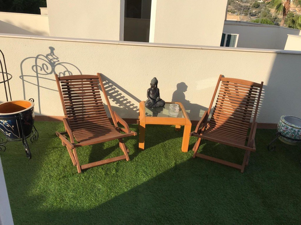 In addition, it has a large patio next to the main entrance. First Floor: Offers two bedrooms, all with built-in wardrobes and some with a full bathroom Top Floor: It has a large hall and a large solarium terrace, perfect for enjoying outdoor activities such as having breakfast, sunbathing or setting up a summer kitchen with barbecue. The gated community has a communal pool surrounded by well-kept gardens, perfect for cooling off on hot days. The house includes a private garage in the price. Villajoyosa beach and Benidorm are just 20 minutes away by car, and all infrastructure and public transport are within walking distance (Údaco supermarket, medical center, sports area, bars, restaurants, etc.).