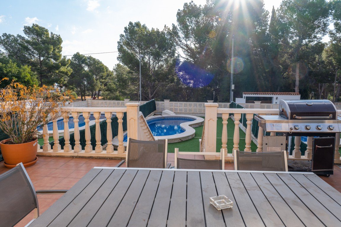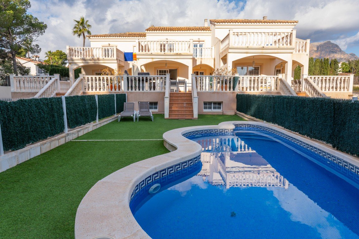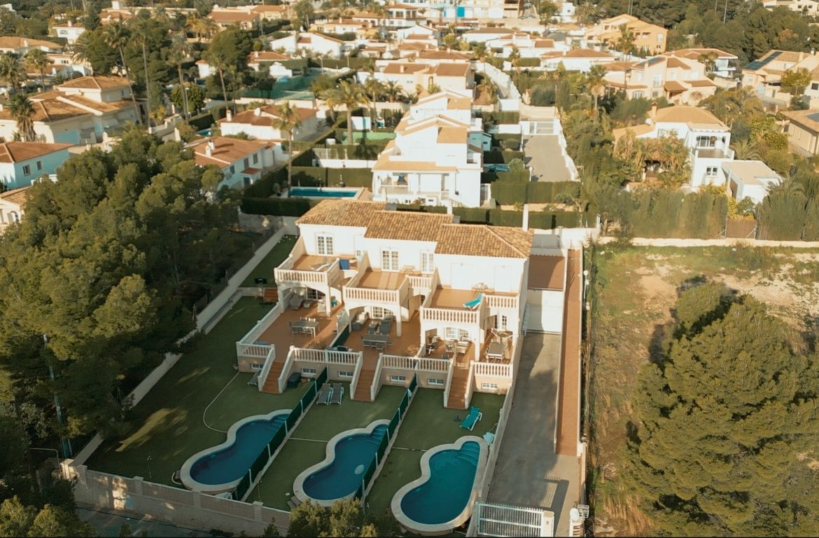 In the beautiful small town of La Nucia we have three large exclusive houses for sale built in 2017, from 350,000 euro The properties are located in the immediate vicinity of sports facilities, golf courses, amusement parks, attractions and restaurants. The houses are almost identical with 3 floors, 4 bedrooms, 2 large bathrooms with toilet and in addition 1 toilet on the main floor. All the houses have wireless internet and TV with all channels, extensive use of downlights and homely furniture. Each house has its own pool surrounded by artificial grass. The three houses share a closed parking basement with space for two cars per house, bicycles and other sports equipment